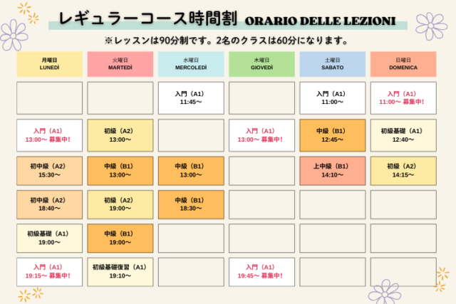 初中級(A2/4級):入門、初級基礎、初級の内容を把握し、簡単なイタリア語での会話ができる。中級に向けての語彙力強化、復習がメイン。