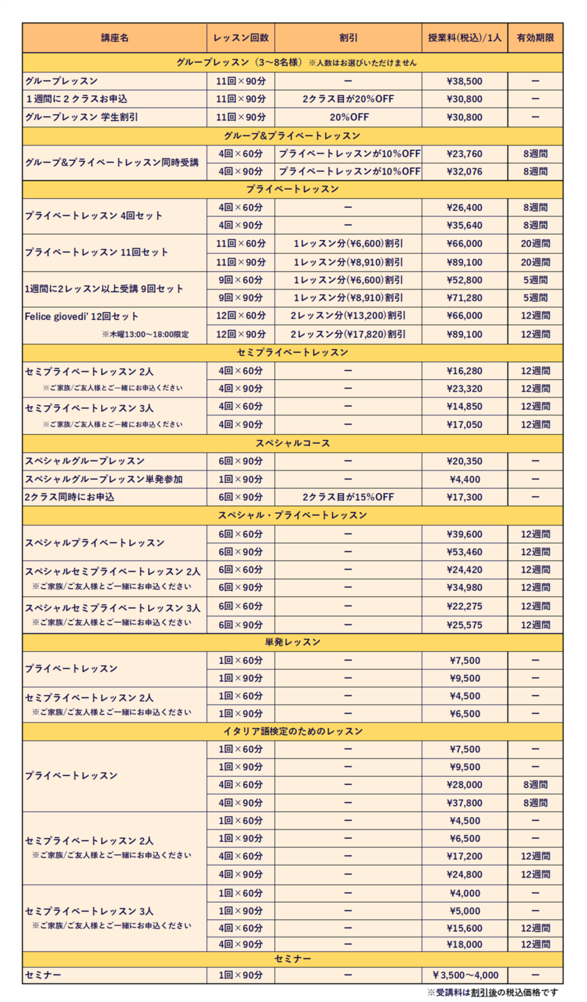 ~Felice Giovedì~ではレッスンの消化期間が12週間以内となります。ご注意ください。