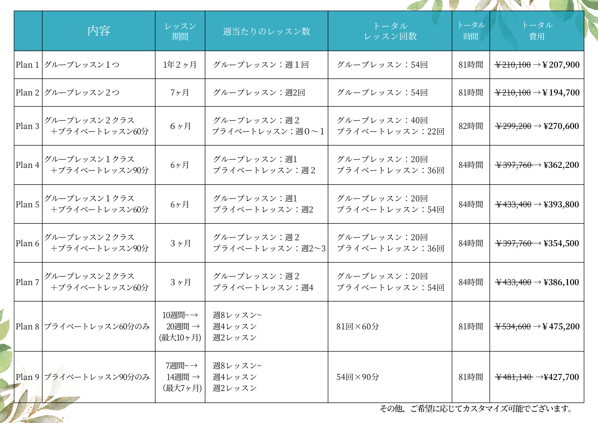※Plan.9と似ていますが、プライベートレッスンが90分制(Plan.9)と60分制(Plan.8)となっています。トータルの時間は同じですが、1回の時間を長くしたい方には<Plan9>、頻度を多くしたい方には<Plan8>をお勧めいたします。